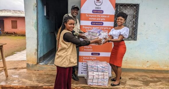 In April 2024, the Organization for Women Empowerment and Development (OWED) made a meaningful contribution to the National Movement of Adolescent Girls and Young Women in Cameroon (NMAGYW) by donating disposable sanitary pads to support their ongoing project, “Her Wellness Community Outreach Initiative.”